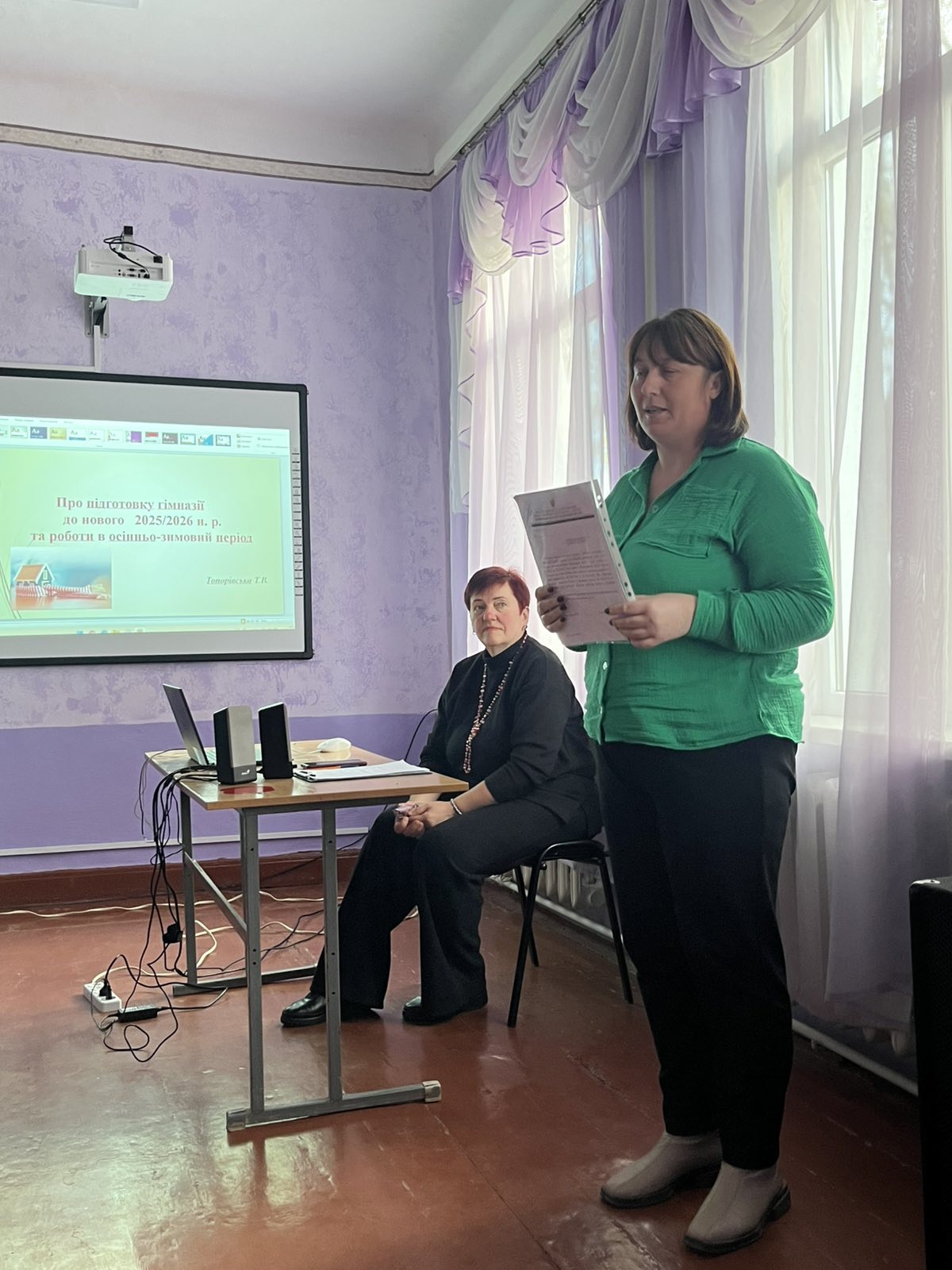 Завгосп Топорівська Т.В. підсумуванола роботу з підготовки гімназії до нового навчального року та осінньо-зимового періоду: проведено поточні ремонти, оновлено навчальні кабінети, перевірено систему опалення та укриття для безпеки учасників освітнього процесу.