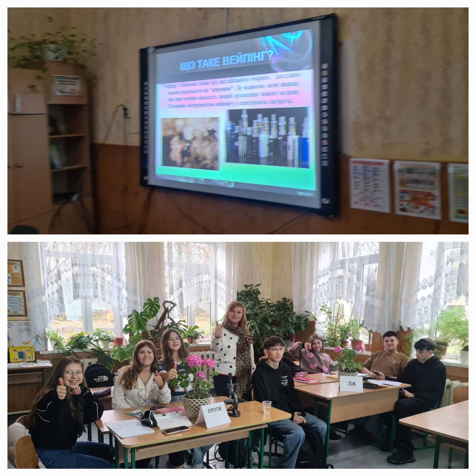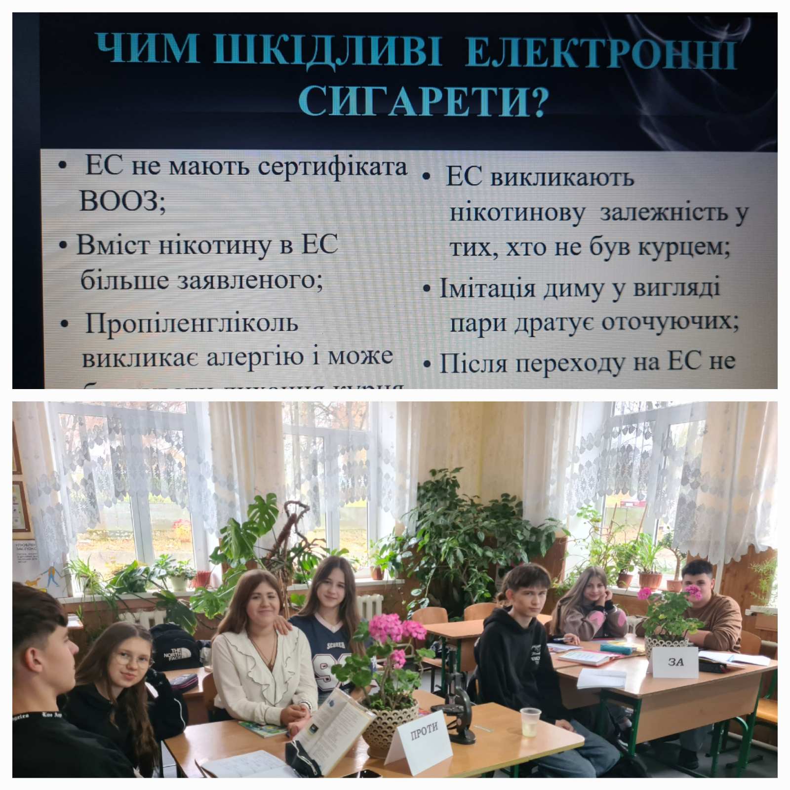 Учні 9 класу дискутували про шкідливість вейпінгу для здоров’я. Електронна сигарета має негативний вплив на здоров’я, включаючи серцево-судинні проблеми, шкоду для дихальних шляхів та ризики для мозку (особливо у підлітків, через вплив нікотину на навчання та пам'ять).