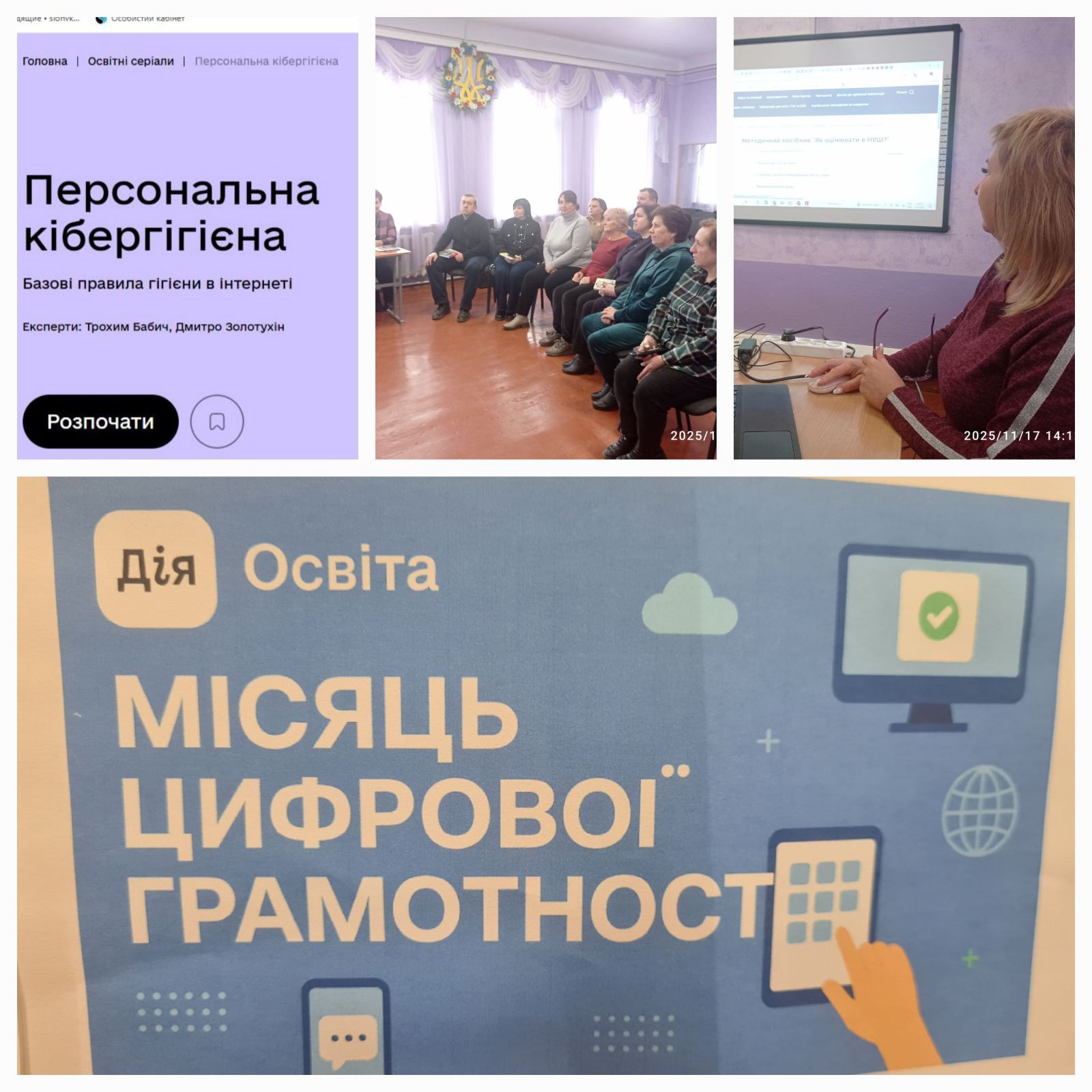 Відповідно до листа Міністерства освіти і науки України від 03.11.2025 № 1/23096-25, в рамках Місячника цифрової грамотності, згідно плану, 17 листопада вчителі гімназії ознайомились з ресурсами, які допоможуть підвищити рівень цифрової грамотності. В результаті роботи педагоги зрозуміли , що цифрові знання мають вирішальне значення для протидії пропаганді та дезінформації, розпізнавання фейків, ефективного використання цифрових технологій для особистої безпеки, сприяння перемозі та забезпечення сталого розвитку країни.
