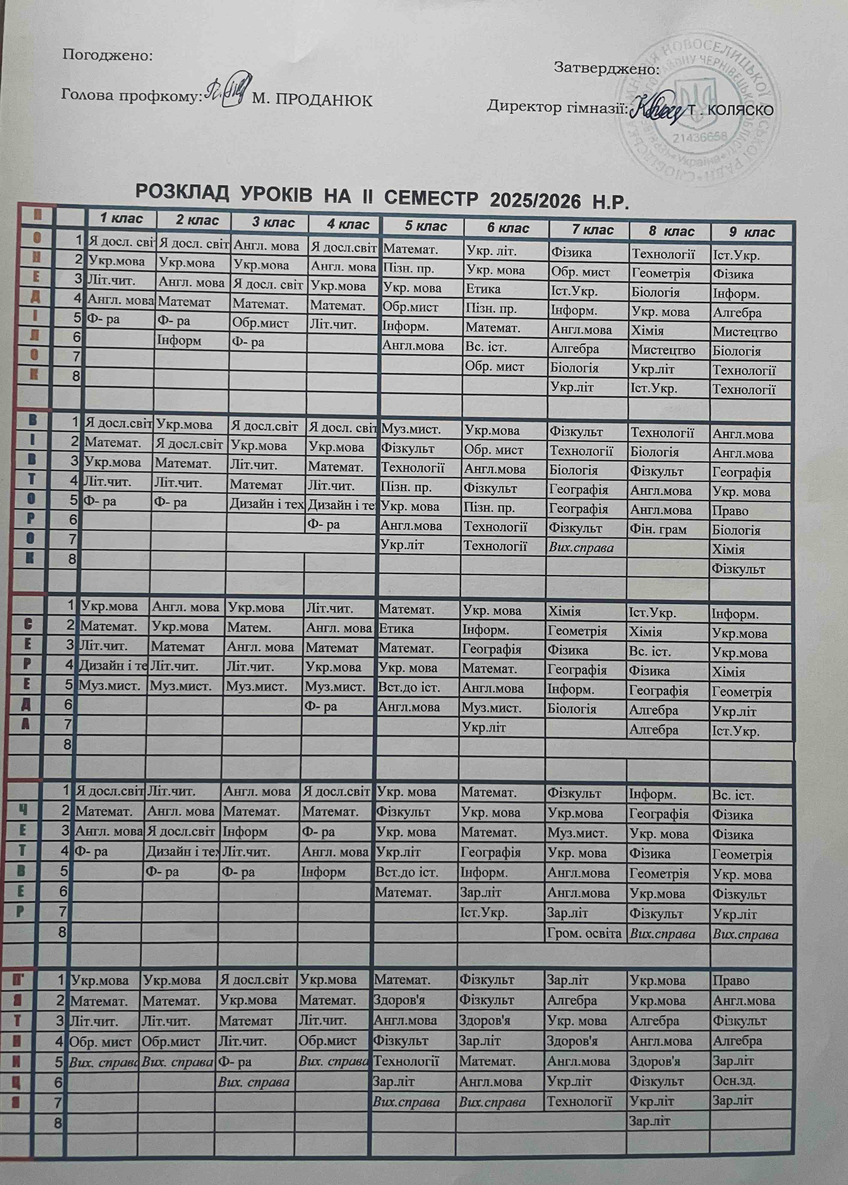 Розклад уроків на ІІ семестр 2025/2026 н.р.