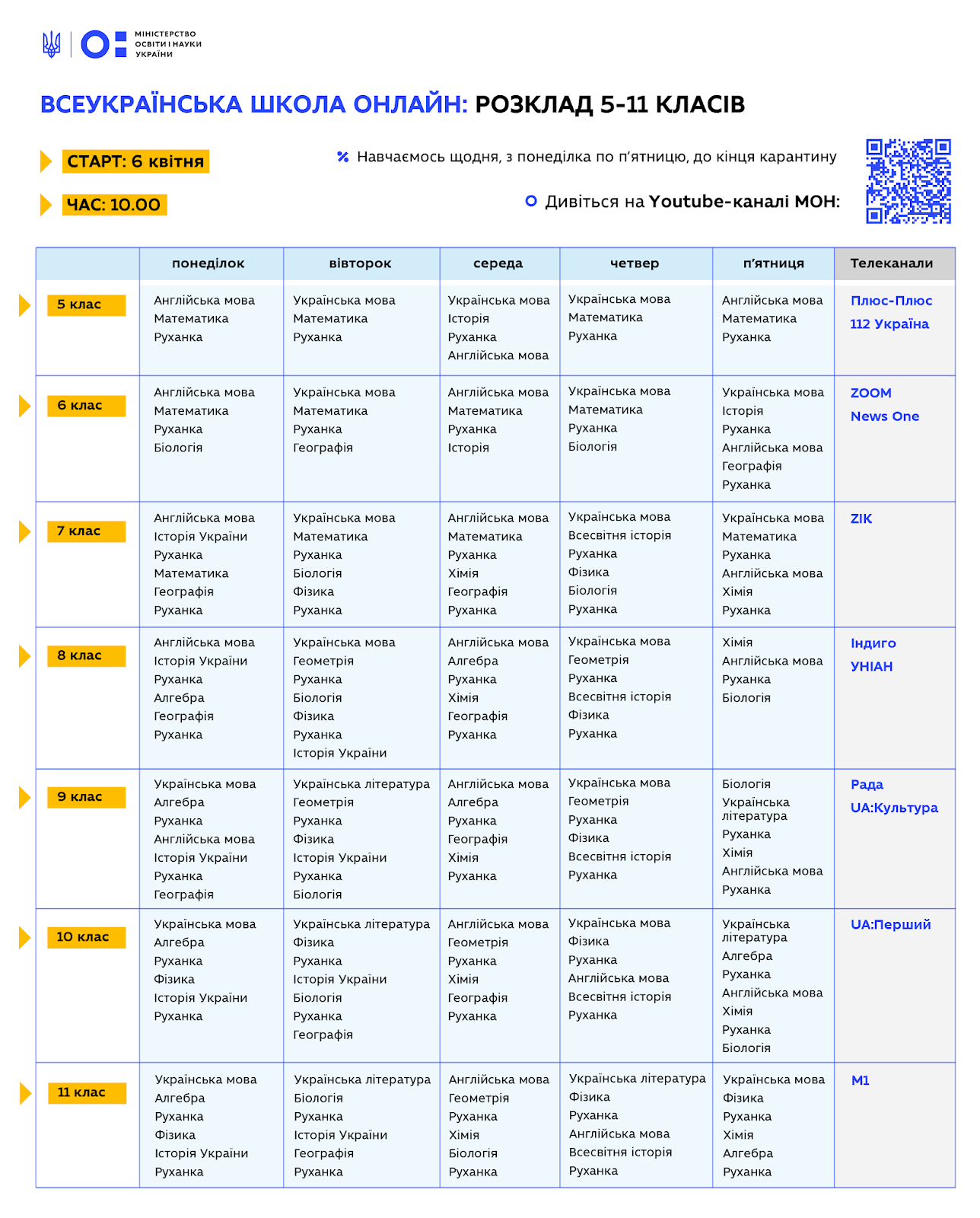 В понеділок, 6 квітня, о 10:00 для учнів 5-11 класів з усієї країни стартує проєкт «Всеукраїнська школа онлайн» – уроки з 11 предметів, які за чітким розкладом транслюватимуть українські телеканали та YouTube-канал Міністерства освіти і науки.